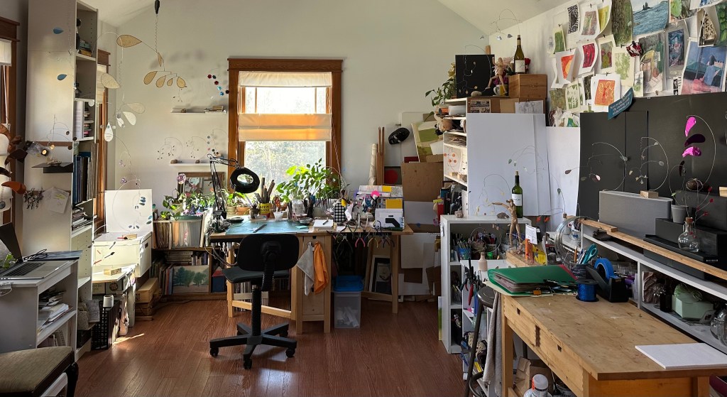 Welcome to my studio. All of the mobiles are created here. Some begin as pencil sketches, others as 3-D sketches. Often an idea springs from a “what if…” while I am working on another mobile. Materials can be inspiring in themselves. Translucent, reflective and matte blades offer an endless variety of elements with which to design.